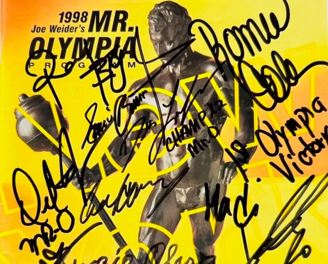 A unique bodybuilding item is currently for sale. It’s a 1998 Mr. Olympia program. Well, that’s sort of unique. Ronnie Coleman’s first win. What does it go for—$75? No. $100? No, higher. $150? As of today, it’s priced on eBay at $11,049.99 (or best offer)! The reason for the greatly inflated price is because this program is signed by 14 of the 18 Mr. Olympias.