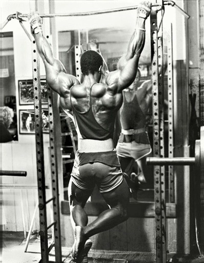 Analysis: We can’t argue with the phenomenal chest results Nubret achieved. Note that he was doing 50% more sets for chest than for quads, though the latter is a bigger bodypart. Dumbbell pullover is a better back exercise than chest exercise, though he probably did feel it more in his pecs by doing it last.